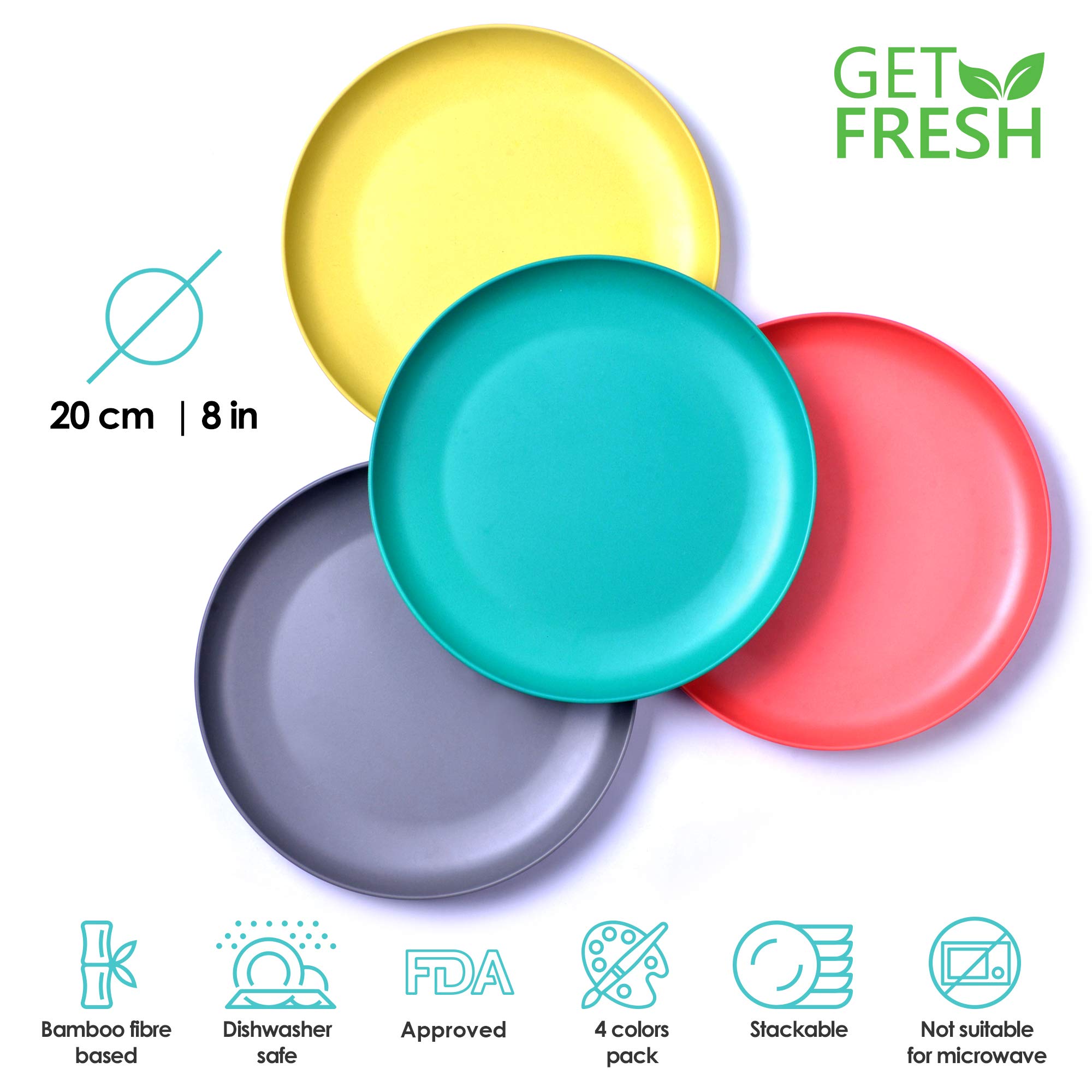 GET FRESH Bamboo Kids Plates Set 4-pack Reusable Dinner Plates for Toddlers Colorful Bamboo Fiber Childrens Dinnerware Set for Everyday Use