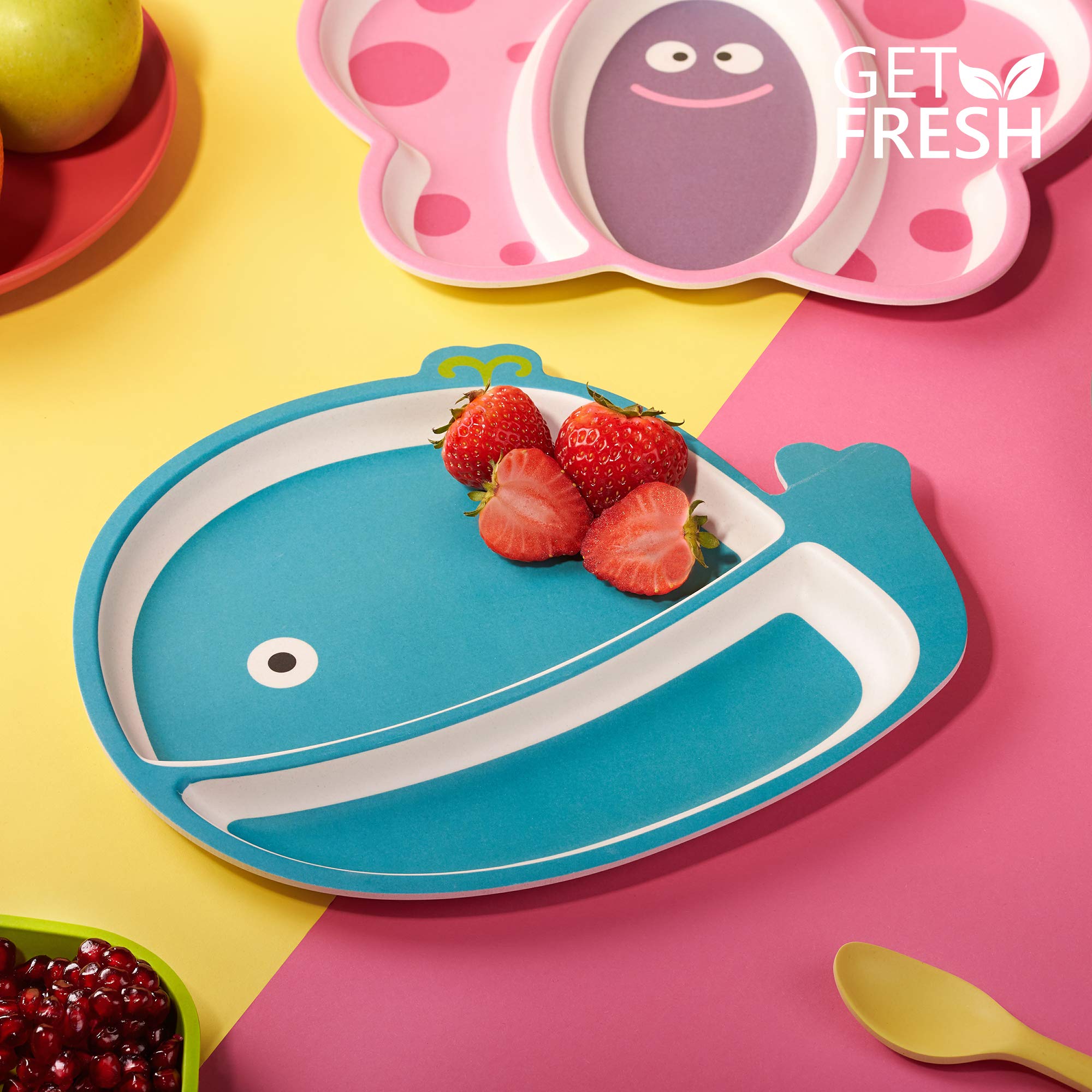 - ✮ CATCHY ANIMAL DESIGNS ✮ — GET FRESH bamboo toddler divided plates offer 3 extremely cute KIDS designs - little busy BEE, colorful curious BUTTERFLY, big and fearless WHALE. With adding a pinch of the fantasy every kid’s meal can be like a big adventure! Your kid will absolutely fall in love with our animal design bamboo toddler tableware and make their mealtime fun and joyful!