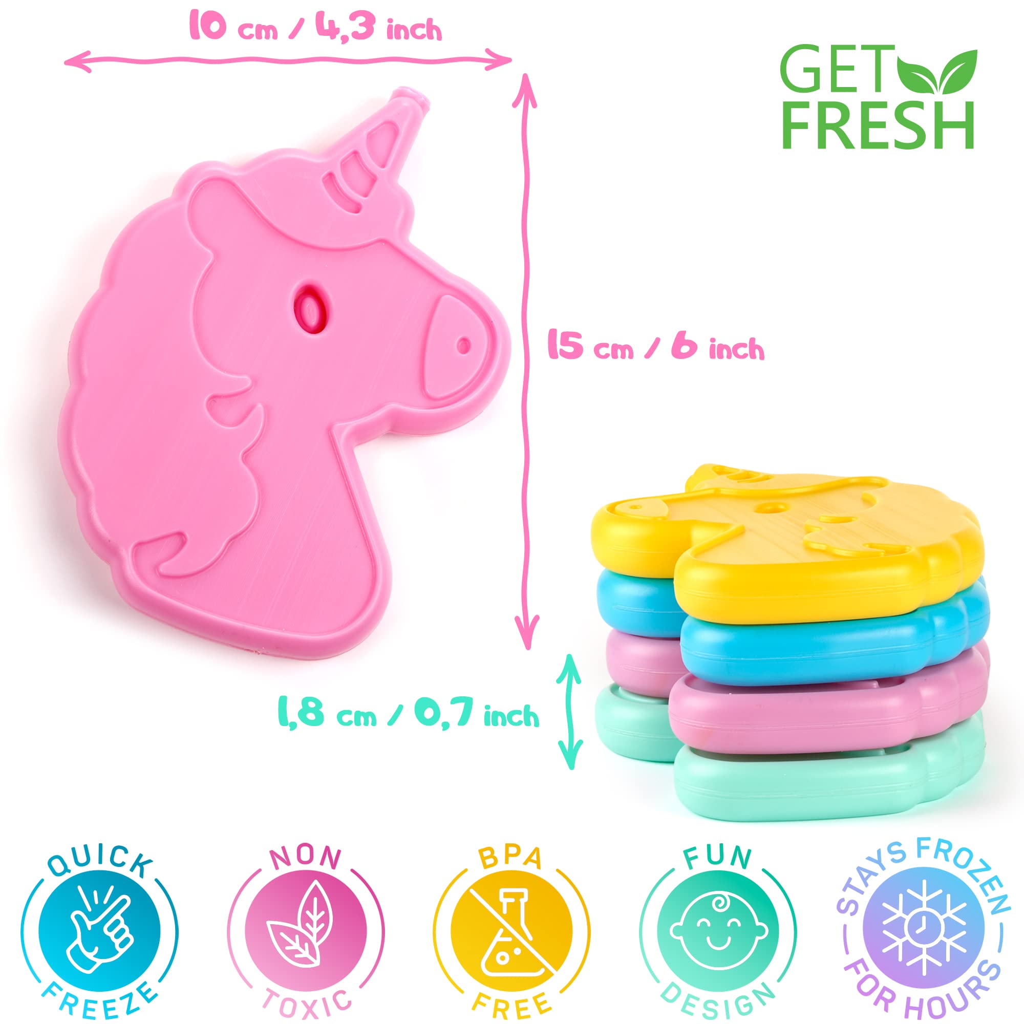 GET FRESH Mini Freezer Ice Packs for Kids Lunch Box – 4-Pack Unicorn Small Freezer Blocks for Cool Bags and Lunch Boxes – Colorful Mini Ice Blocks for Kids Lunch Boxes Bags with 10 Food Picks